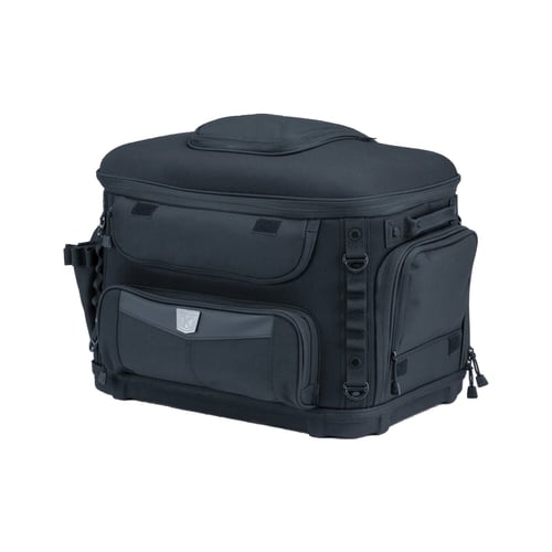 The most versatile motorcycle small pet carrier available. Updated styling, four mesh windows for viewing. Top window opens allowing your pet to pop its head out. 40% more ventilation with 20% more internal space than the previous model. Easy-clean removable foam cushion and includes internal adjustable leash, two dishes, and removable stash pouch. An internal frame with rigid structural support offers peace of mind and safe transport. Sissy bar strap, multiple D-rings and adjustable straps offer easy, secure mounting options for safe travels. From Weather-resistant 1200 denier textile material with removable rain cover. Weight capacity is 20lbs / 9kg. Dimensions: 18.5" (47cm) wide x 13" (33cm) deep x 14" (35.6cm) tall.