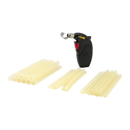 31 piece kit, dual wall with waterproof sealant. Includes 3/16" (4.8mm), 5/16" (7.9mm) and 1/2" (12.7mm) diameters. (Shrinks 2.5 times in diameter. Temp. range -55°C to +110°C. Includes flameless heat torch in which a regular disposable cigarette lighter can be installed as gas-source.